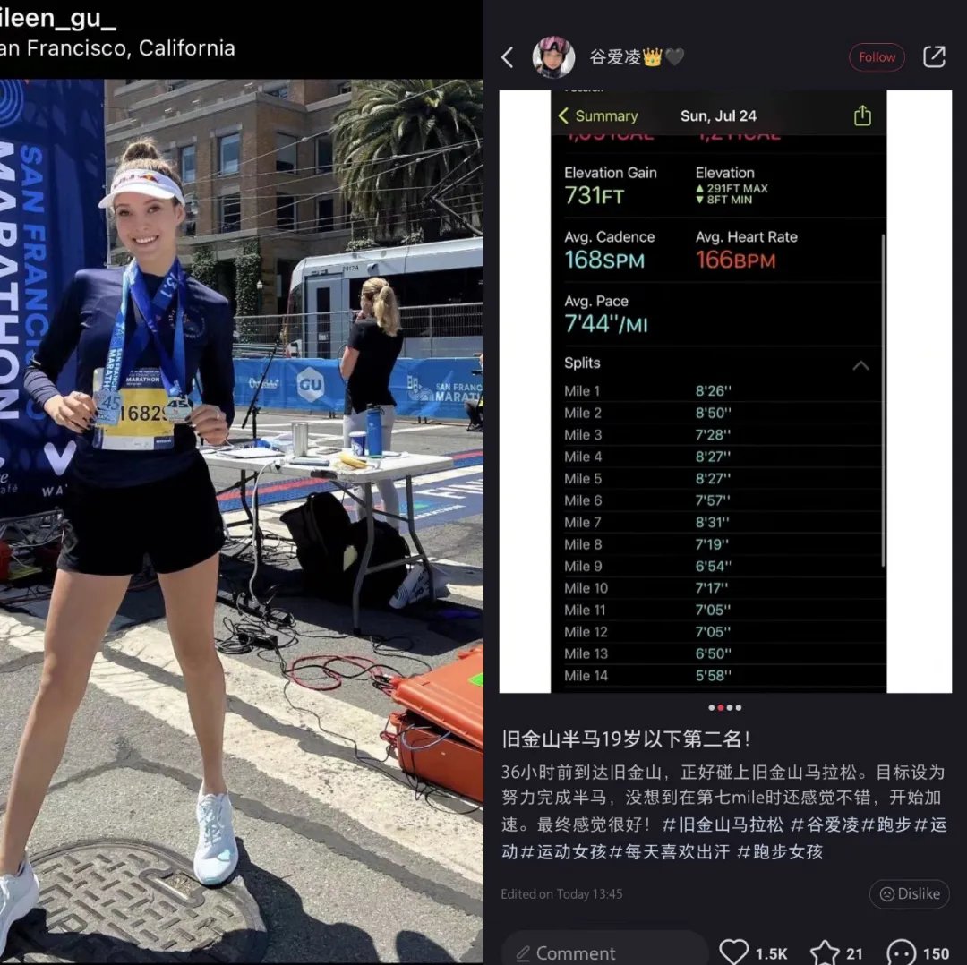 令人意想不到的是,本次旧金山马,滑雪奥运冠军谷爱凌也来了,并且以1小时41分,跑出了女子年龄组第二的好成绩。