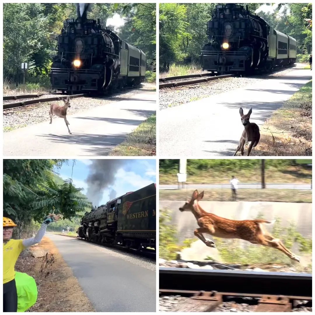 骑近小城突然看到前面黑烟滚滚,以为是失火,打听了才知道是老式的蒸汽机车正在启动载着游客观光。我们下车等拍视频,意外拍到小鹿被汽笛惊吓奔逃的瞬间。